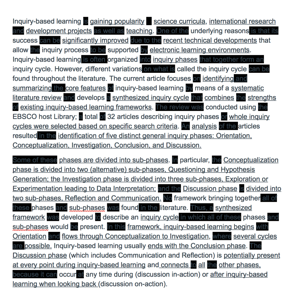 Inquiry-based learning is becoming popular in science, international research, and development projects. These are all based off of electronic learning environments. Inquiry-based learning done in phases forming the inquiry cycle. There are many variations of the cycle, all the strengths of them combine to form 5 phases; Orientation, Conceptualization, Investigation, Conclusion, and Discussion. There are some subphases. Conceptualization has two subphases, question and hypothesis. Investigation has three subphases,exploration or experimentation and data. Discussion has two subphases, reflection and communication.